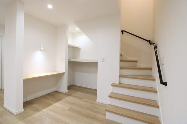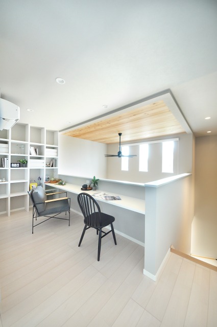 リビングから少し離れた場所に設ければ、落ち着いて作業できるワークスペースにもなります。カウンターを設けて書斎風に仕上げれば、家族の気配を感じつつも集中できる空間に。