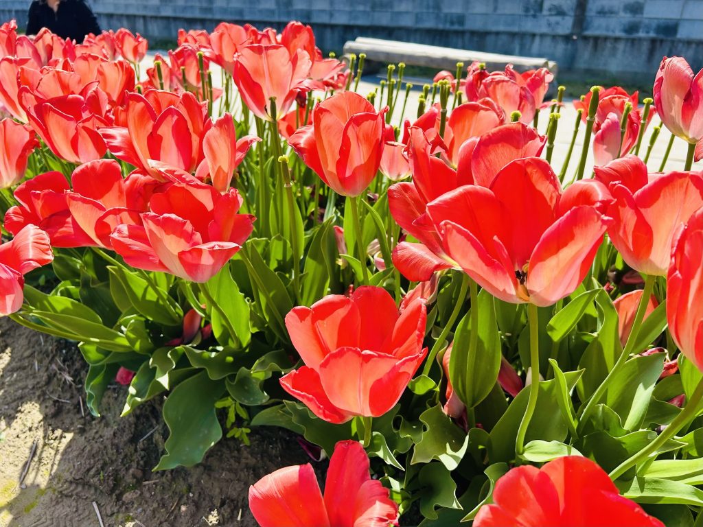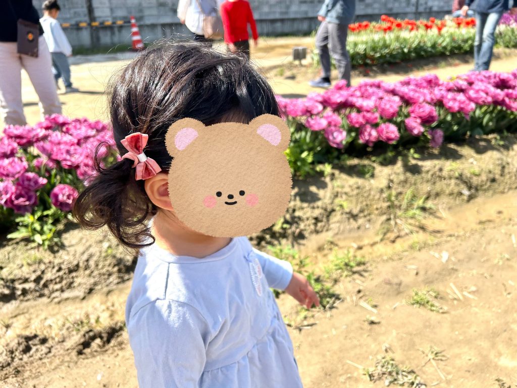 色とりどりのチューリップが一面に広がっていて、「あか!」と指をさしながら楽しそうに歩いていました。