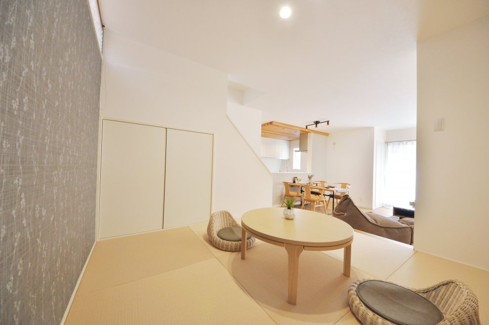 小上がりの和室はちょっとした休憩やお客さまへのおもてなしの場にぴったり。大容量の階段下収納を設置しています。