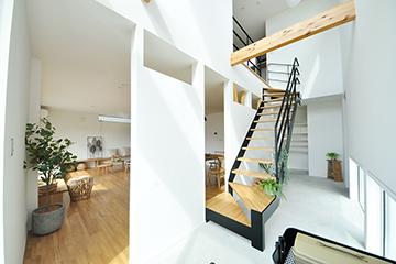 玄関からLDKに繋がる通り土間は、陽をたくさん取り込める吹き抜けに。オープン階段が解放感を強めます。