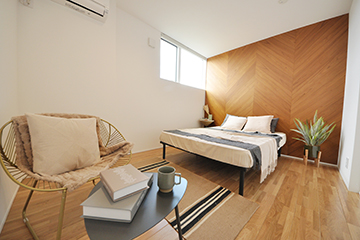 主寝室はヘリンボーン柄の突板でカッコよく。