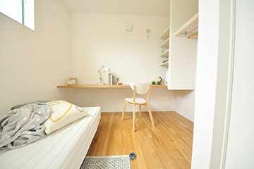 デスクと棚、洋服ハンガーパイプを一体化しているので、狭さを感じないつくりになっています。年齢問わず使える部屋です。