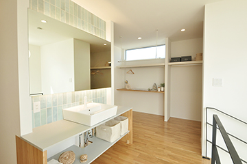 2階に水回りを設けた間取りで、階段を上がったすぐにオシャレな洗面に出会えます。建築家ならではのアイデアです。