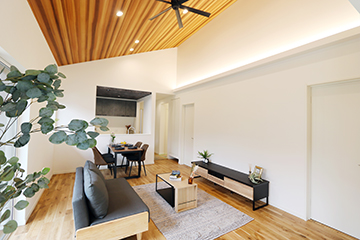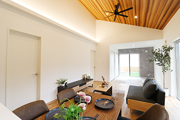 16帖の広々LDKには和室を併設。勾配天井を採用し開放的な印象をプラス。シーリングファンと木目調クロスがアクセントに。