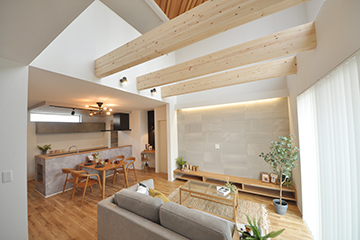 南側に大きな吹き抜けを設けたLDK。フローリングは無垢材、テレビボード側の壁にはタイルを設置し、カジュアルな装いのなかに高級感をエッセンスとして詰め込みました。