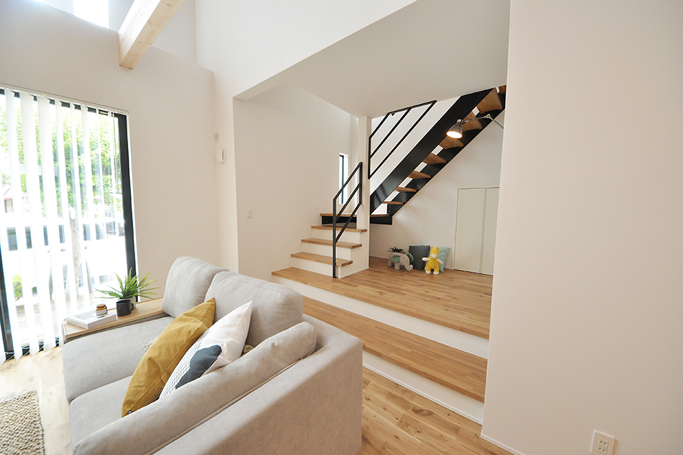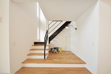 ヌックスペースは子どもの遊び場として、大人の趣味の場所として楽しめます。2階へ上がる階段は途中から鉄骨階段にし、ヌケ感を演出。