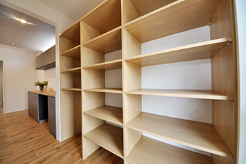 玄関土間からキッチンに直接向かえる回遊動線。大型の収納棚を設けているので、いろんなものが収納できます。