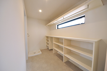 家族全員分の着替えが収納できるほどの棚を設置。ハンガーパイプも設けているので洗濯を干すことが可能です。