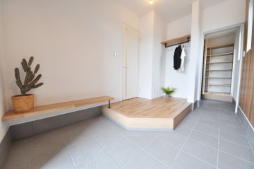 奥行きのある玄関土間。洋服をかけることができる棚、シューズインクローク、パントリーと直線動線を採用しました。ベンチがあるのが嬉しいです。