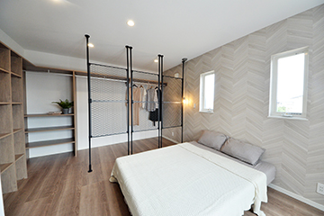 ダブルベッドを置いても広々な寝室。洋服をたくさん片づけられるウォークインクローゼットとの境が曖昧だから開放的な空間を演出。