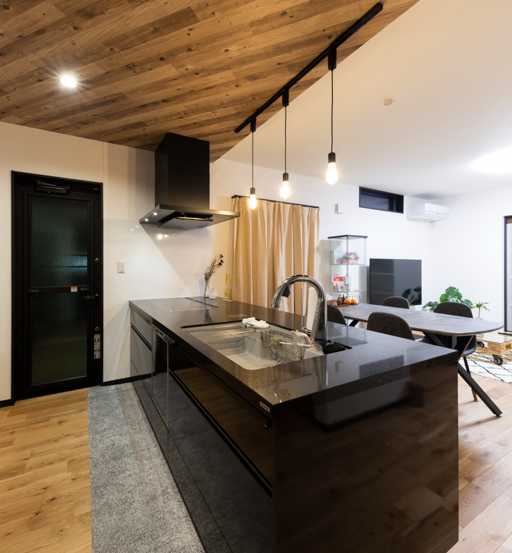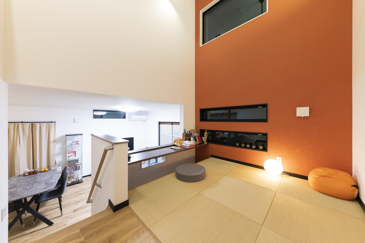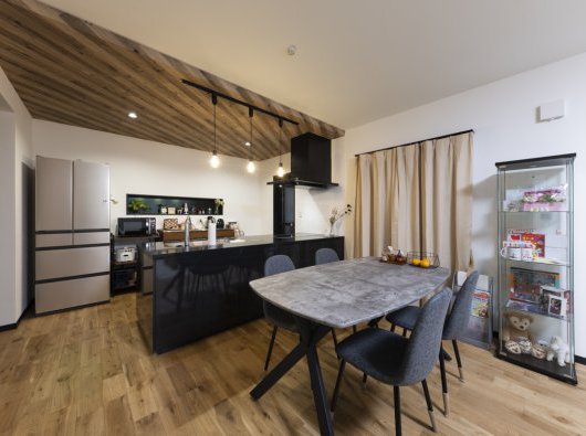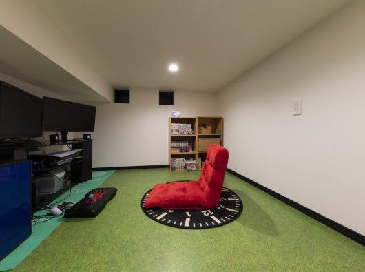 一番最初に見学したケントホームズさんのモデルハウスが私たちの感性に合っていてすごくよかったので、その家を参考にさせてもらったんですよ。外観は黒・木目・白の3色で構成されているので、リビングもその3色を使ってデザインしてもらいました。また、モデルハウスで見た中二階・吹抜け・半地下のピットルームに興味を惹かれて、それらも自分たちの家に取り入れました。中二階のスキップフロアは妻の作業用スペースとして、半地下のピットルームはゲームや読書の部屋として活用しています。