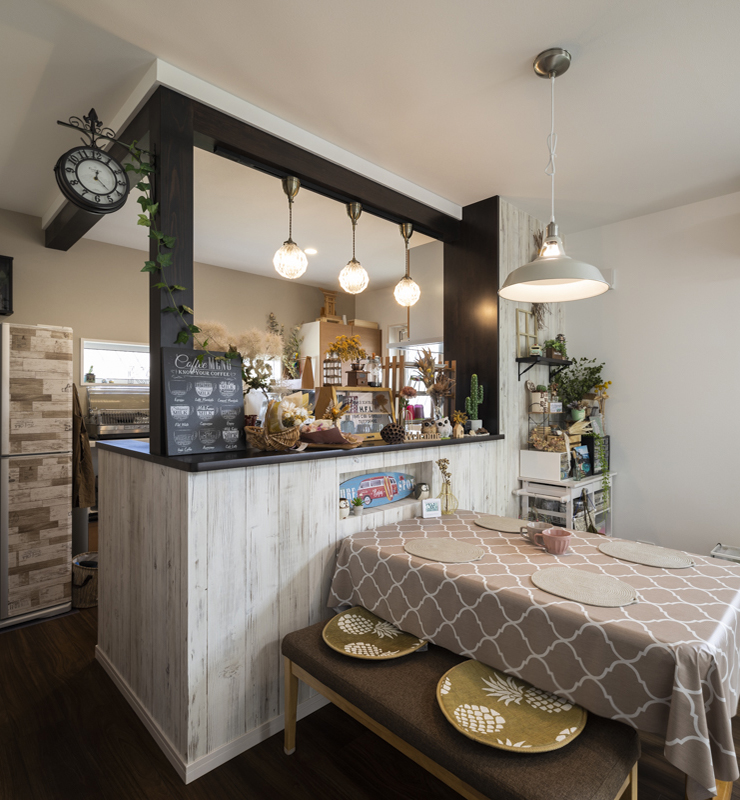 家の中ではリビングやキッチンにいる時間が長いので、その周辺にこだわりを詰め込みました。キッチン周りに飾り柱を配置した他、キッチンカウンターを広くとって雑貨などをたくさん飾れるようにしています。吊り下げ電球や柱時計で空間を可愛くみせたところもポイントですね。アンティークカフェ風にしたかったので、内装にこだわって大人可愛い家に仕上げました。