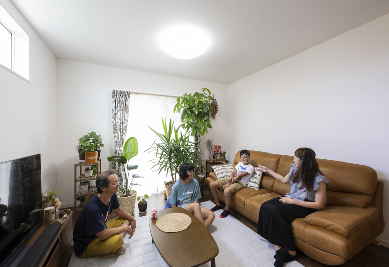 植物も喜ぶ、快適リビング前に住んでいた家は室内の日当たりが悪くて、断熱性も低かったので、住み心地があまりよくなくて。だから今回はその部分にもこだわってみたのですが、やっぱり全然違いますね。夏は涼しいですし、冬は温かくて暮らしやすいです。また、そんな住宅性能のおかげか、外からの音が入りにくくなりました。近くに踏切があるんですけど、全く音が気にならないんですよ。日当たりについても、窓から室内に日光がたくさん入ってきて、観葉植物がすくすく育ちますし、日中のリビングは常に明るい状態になっています。