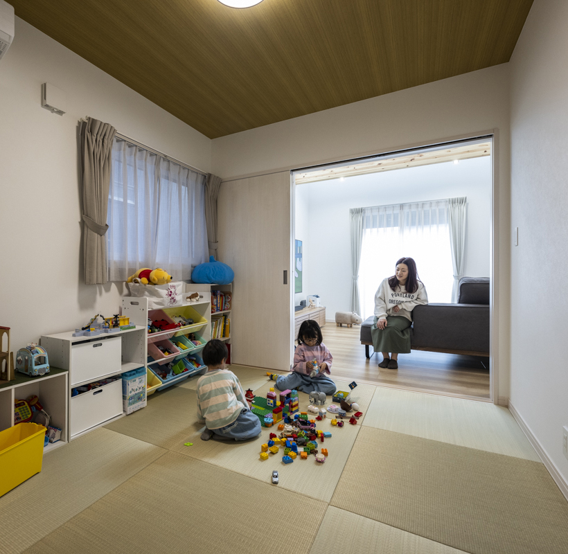家族みんなが集まるリビングを快適な空間にしたいと思って、リビングの上に吹き抜けを作りました。吹き抜けのおかげで開放感がありますし、昼間は太陽光もたくさん入ってくるのでお気に入りです。リビングの隣に作った和室は今は子どもの遊び場として使っていますが、子どもが大きくなったらひとつの個室として使えるように玄関から直接入れる動線も作っています。
