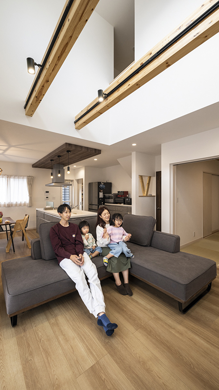 梁見せの吹抜けが明るさと解放感を生み、また広々とした和室があるので