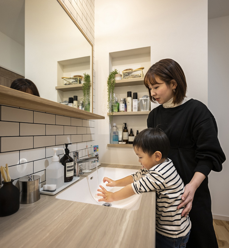 あと、一番のこだわりは造作洗面台です。SNS等で理想に近い洗面台のデザインを探したり、完成見学会で実際に見た洗面台を参考にしたりしながら、我が家のオリジナルを作ってもらいました。収納も多く見た目もオシャレでとても気に入っています。 -