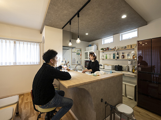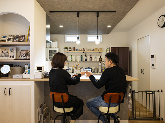 夫婦2人ともお酒が好きなので、キッチンのカウンター部分をバーカウンターみたいに使えるように少し広めにしてもらいました。キッチン背面にはお酒のボトルを飾って置いておける棚も作ってもらいましたし、いつもここでお酒を飲んでいます。また、たくさん友だちが来た時にはカウンターを有効活用してテーブル代わりに使ったり、お鍋などの料理を置いたりとかして、すごく重宝しています。