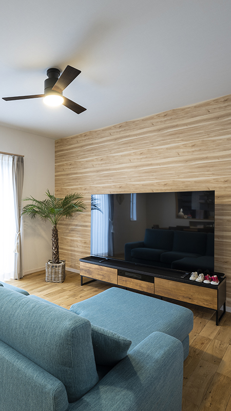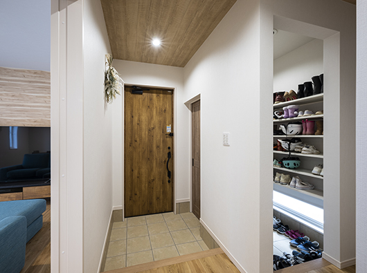 まず家族みんながストレスなく暮らせるという部分を一番大事にしたいと考えていました。なおかつ、木の温かさを夫婦2人とも好きだったので、木材を生かせるお家にしたいという思いがありました。玄関を入ってすぐの天井も木目調にしましたし、リビングにも無垢材などを使用したり。木目も木の温かさがより感じられるようなものを選んでいます。