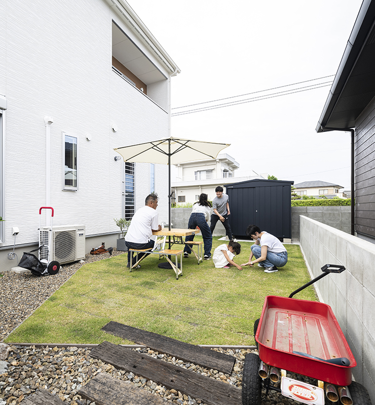 元々アウトドアが好きな家族だったんですけど、庭があるお家を建ててからは週末はほぼ庭で遊ぶような休日スタイルになりました。生活の基盤がガラッと変わりましたが、すぐにしっくり馴染んで、今では家に帰ってくるのが楽しみな暮らしになっています。
