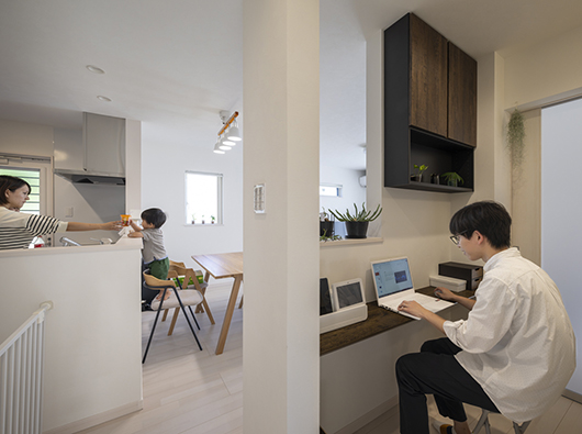 あと、仕事を家に持ち帰って作業するスペースが欲しかったので、ダイニングの横に書斎のようなデスクスペースを作ってもらいました。仕事をしながらも家族とコミュニケーションがとれるように個室じゃなく半オープンなスペースにしています。PCで作業しながらも子どもたちの顔が見れたり声が聞こえたりするので、すごく気に入っているポイントです。 -
