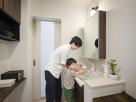 あと、洗面所が玄関を入ってすぐのところにあるので、帰宅時にすぐに使えて便利ですし、子どもを見ながら使える位置なのですごく安心です。