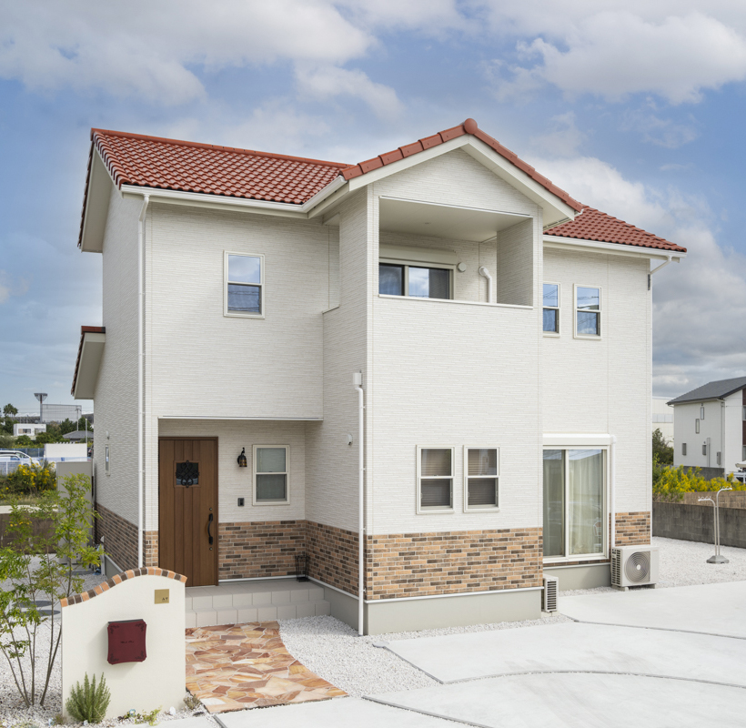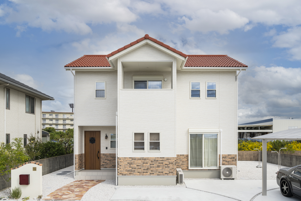 やっぱり可愛いお家にしたかったので、建物の中心部分が前に出ているような形にして、白とレンガ調の外壁に赤い屋根で可愛い外観にしています。お城風の外観に見えるようにデザインしたのもポイントです。