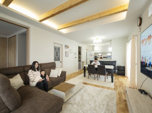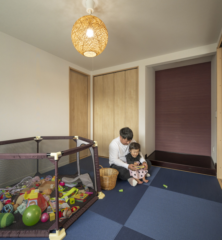 室内は家族でゆったり過ごせる広くて明るいリビングと、子どもが遊べる和室にこだわっています。和室はリビングと繋がっているので子どもが一人で遊んでいても様子を伺えますし、玄関ホールとも繋がっているので将来は客間としても使えるようになっています。