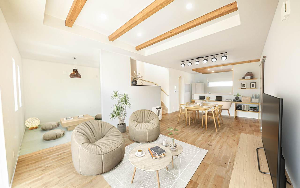リビングには和室やスキップフロアなど隣接している空間がたくさん