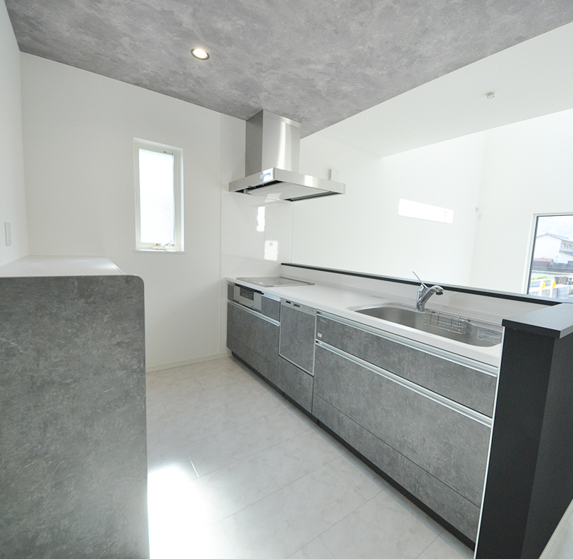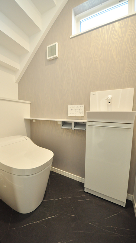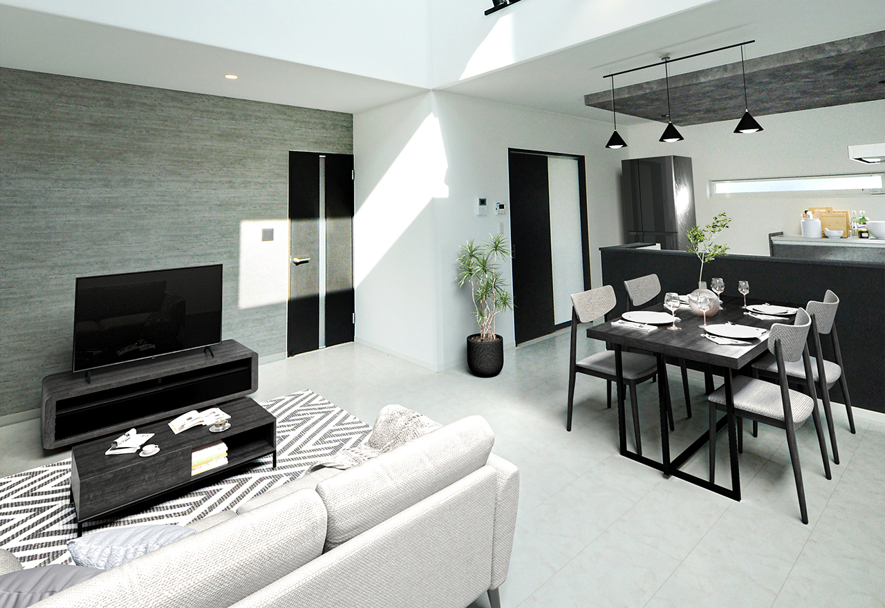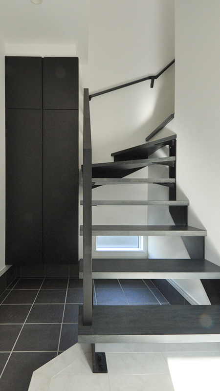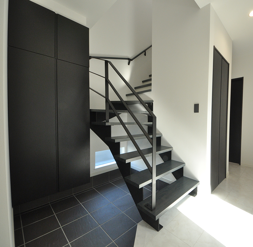 吹抜けとオープン階段が特徴のシックモダン住宅