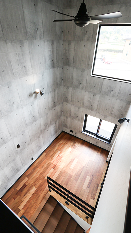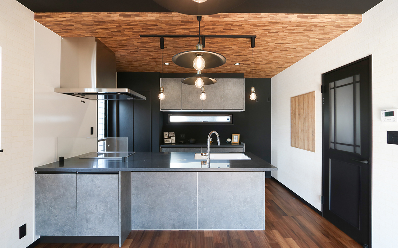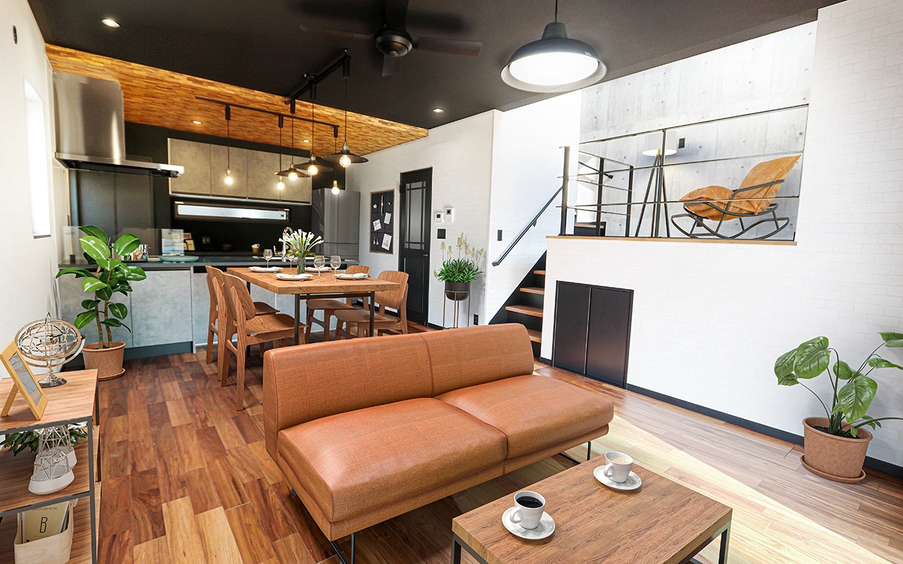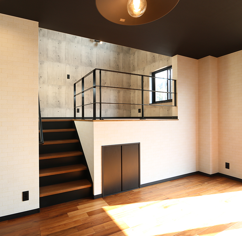 濃い木目やアイアン手すりが印象的なブルックリンテイスト