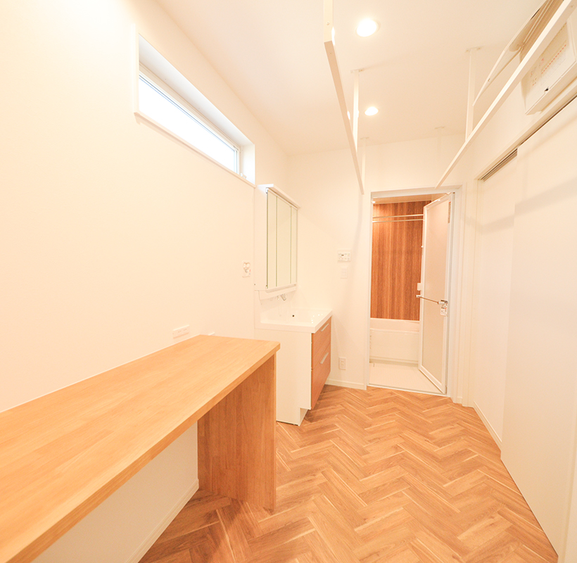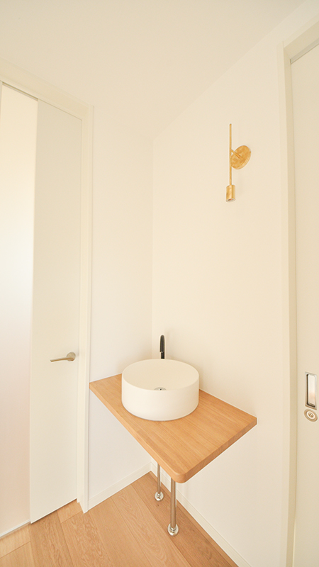 アールの垂れ壁や白の洗面等がカワイイ南欧風住宅