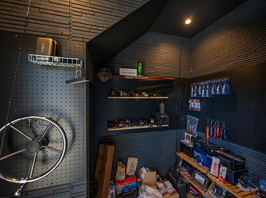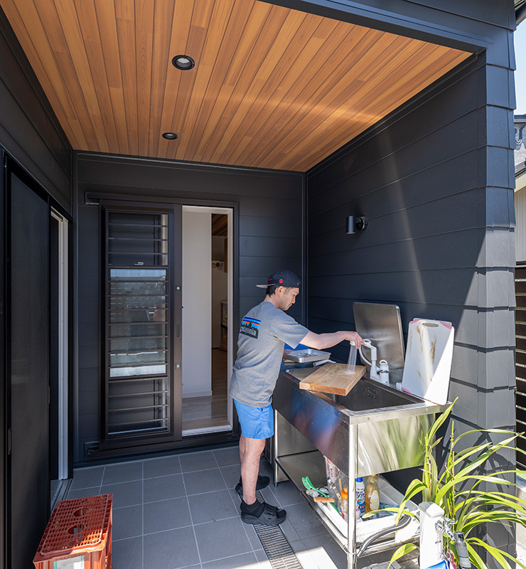 趣味で釣りをしていて、釣ってきた魚を捌く際に、前に住んでいたアパートだと魚の臭いや鱗が飛び散るのがすごく気になっていたので、新しい家では庭のところに外部キッチンを設置してもらいました。ストレスなく魚を捌くことができて、とても便利です。また、釣りをしていると釣具がどんどん増えていくので、釣具用の収納庫も作りました。生活空間とは切り離しているので、家の中がすっきりして、快適な釣りライフを送ることができています。