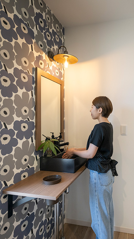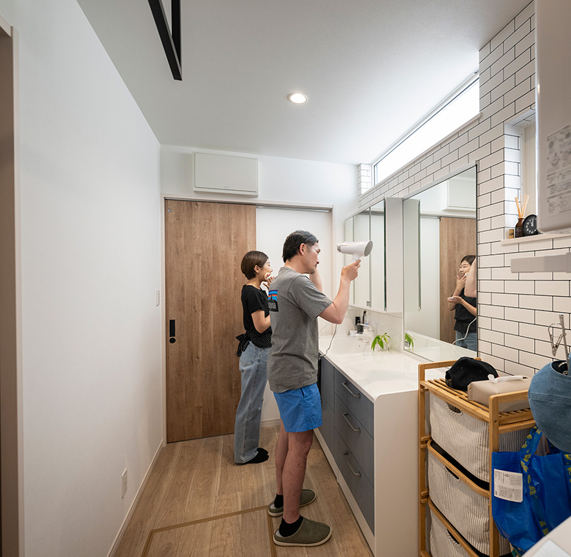 無駄のない家になっていて、限られた空間を有効に使えていると思います。玄関を入ってすぐのところに造作洗面台があるので、友だちが遊びに来たときには気兼ねなくそこを使ってもらえますし、家族用の脱衣洗面所は十分広く取っているので、朝の忙しい時間帯でも2人並んでスムーズに身支度をすることができています。