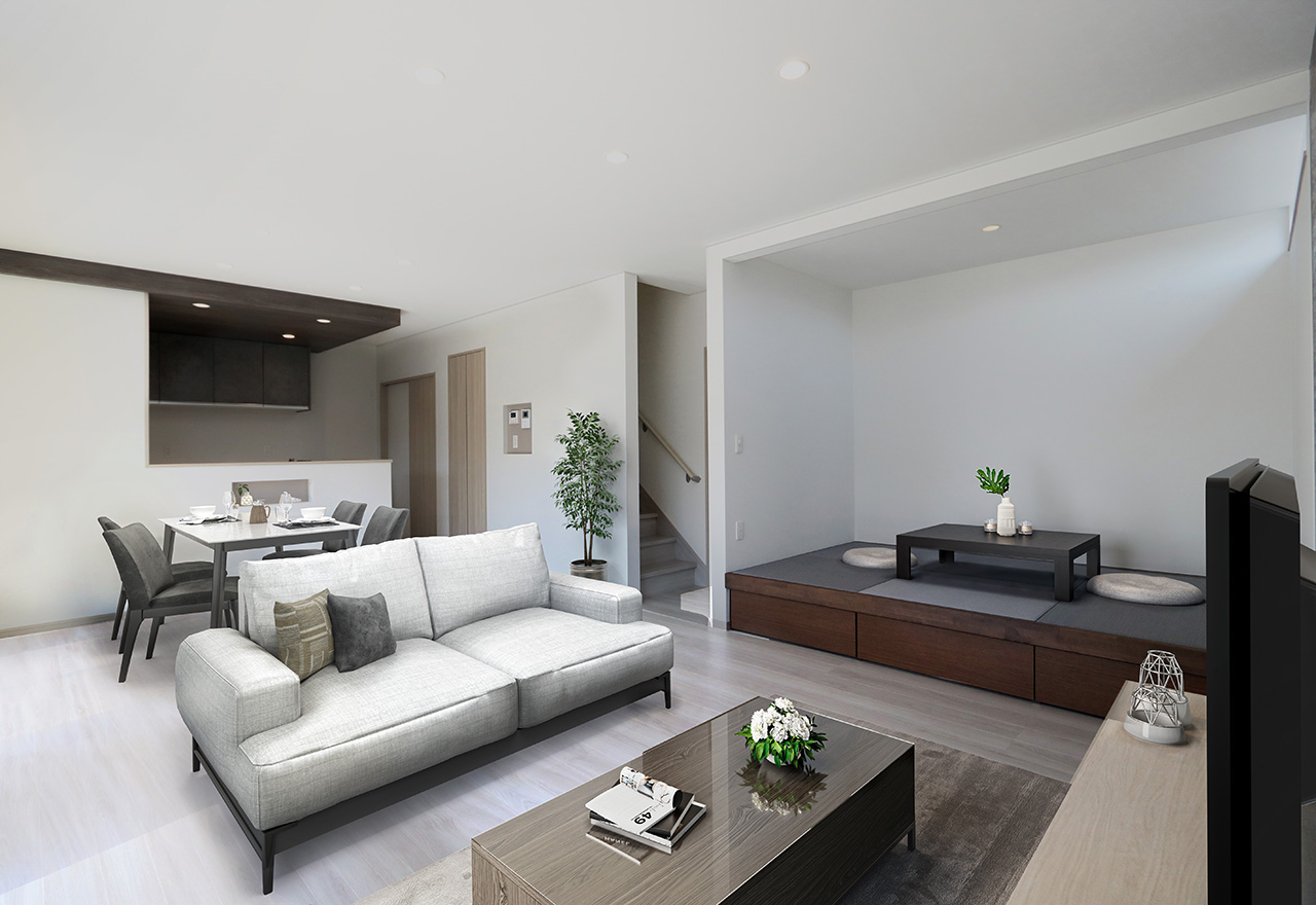 スタイリッシュなモノトーン空間にある小上がり和室で落ち着いたスタイル