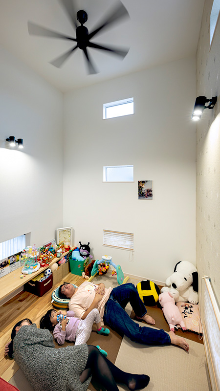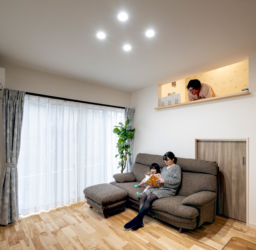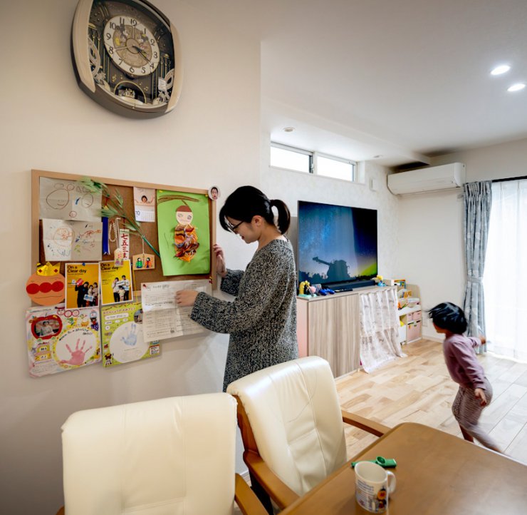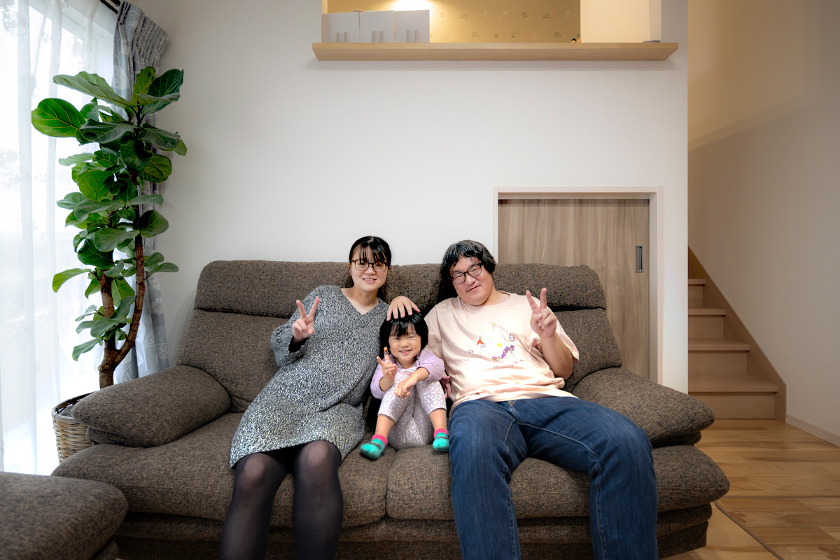以前はアパートで暮らしていたんですが、家事動線がすごく良くなって、家事をしながらでも子どもが遊んでいるのを見守れて、すごく助かっています。それと、吹き抜けの中二階で家族みんなでゴロンとしているのがすごく気持ちいいです。吹き抜けの他にも、リビングに大きな窓があるので、日当たりが良くて明るい家になったなと感じています。