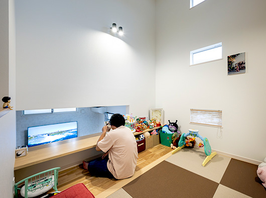 あとは、リビングの上にある中二階と吹き抜けですね。吹き抜けがあると家全体が明るくなるので、必ず作りたいと思っていました。その吹き抜けの下にある中二階では、のんびりテレビを見たり、パソコンで仕事をしたり、コーヒーを飲んだりしたいなと思っていたのですが、実際に住んでみると娘にとられてしまいまして、結局自由に使えないようになってしまいました(笑)。 -