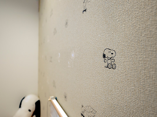 まずこだわりのひとつが壁紙です。スヌーピーが好きだったので、その壁紙を各所に使いました。それと、コルクボードです。家族の交流のためのツールとして、コルクボードがあった方がいいかなと思ったので、ダイニングの壁面に取り付けてもらいました。
