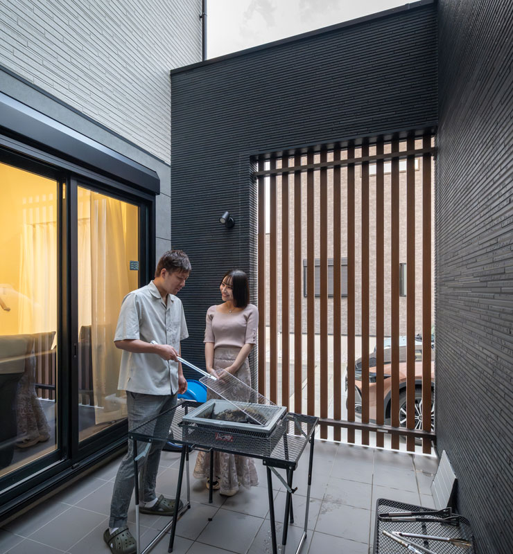 まず、こだわりポイントのひとつは中庭をつくったことです。将来的に、プールなどを置いて子どもの遊び場にしたり、身内でバーベキューをしたり、いろんな用途で使えるように、家の中心部分に中庭を設けています。