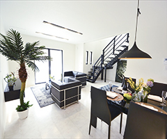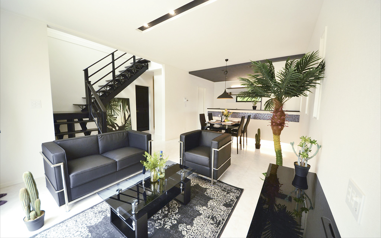 大理石調の高級感のある床材を使用したリビングは黒の鉄骨階段がアクセントに。