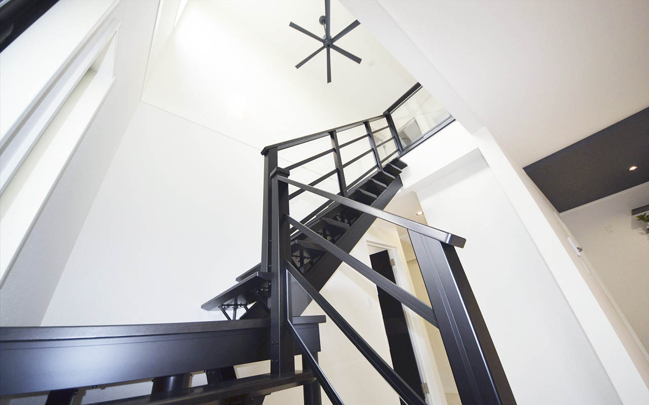 鉄骨階段やシーリングファンに照明、タイルには光沢のある黒、マットな黒と要所で使い分け、モダンなデザインに。外観は白のサイディングにアクセントで金属のサイディングを。