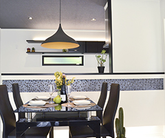 キッチン部にもモザイク柄のタイルを使用し。統一感のあるリビングです。 -