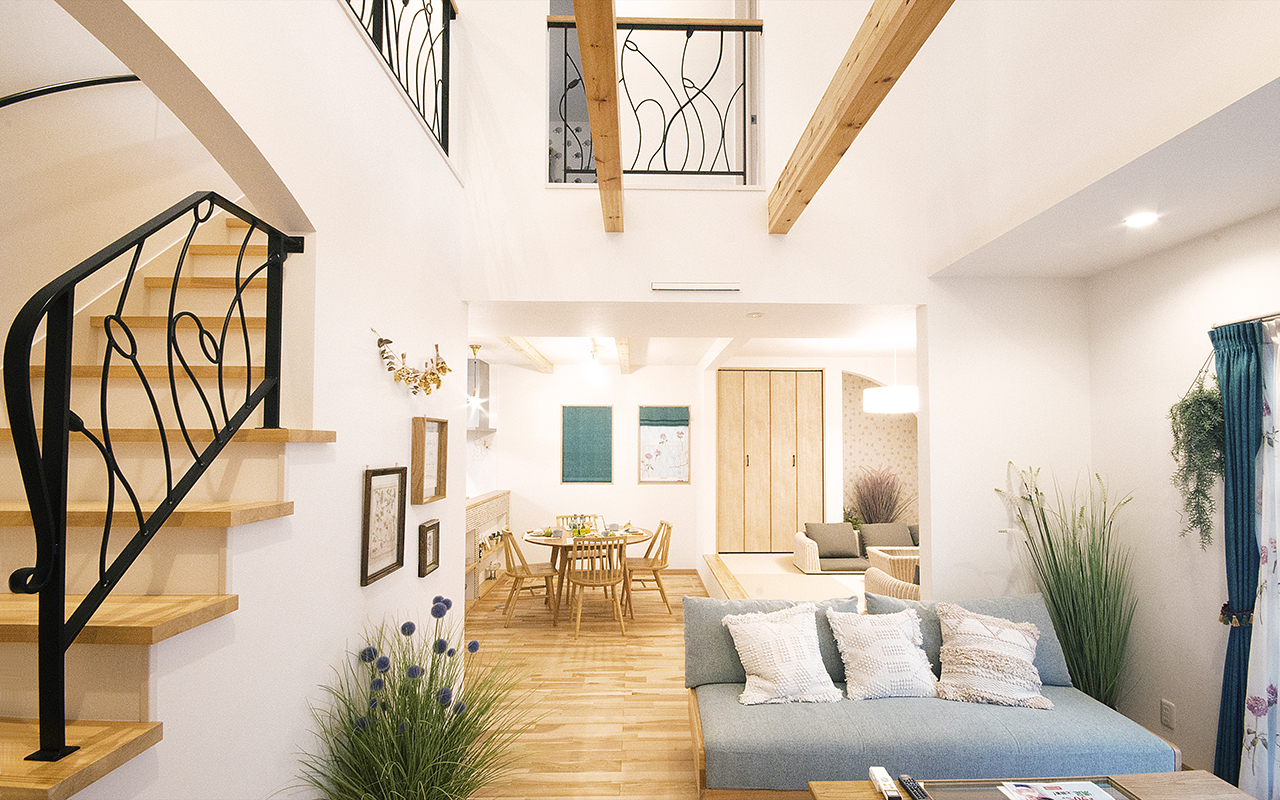 明るめの無垢材を使用したリビングの床に、オーダーのアイアン製手摺がマッチしたお家です。大きな吹き抜けの手摺部分にもアイアンを使用し可愛らしい中にも大人らしさが交じる素敵なデザインです。壁には奥様お好みの絵画を飾り、家族の集まるリビングならではの華やかさを演出します。