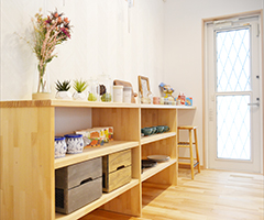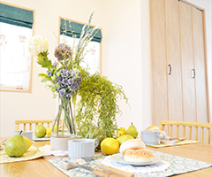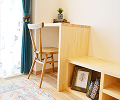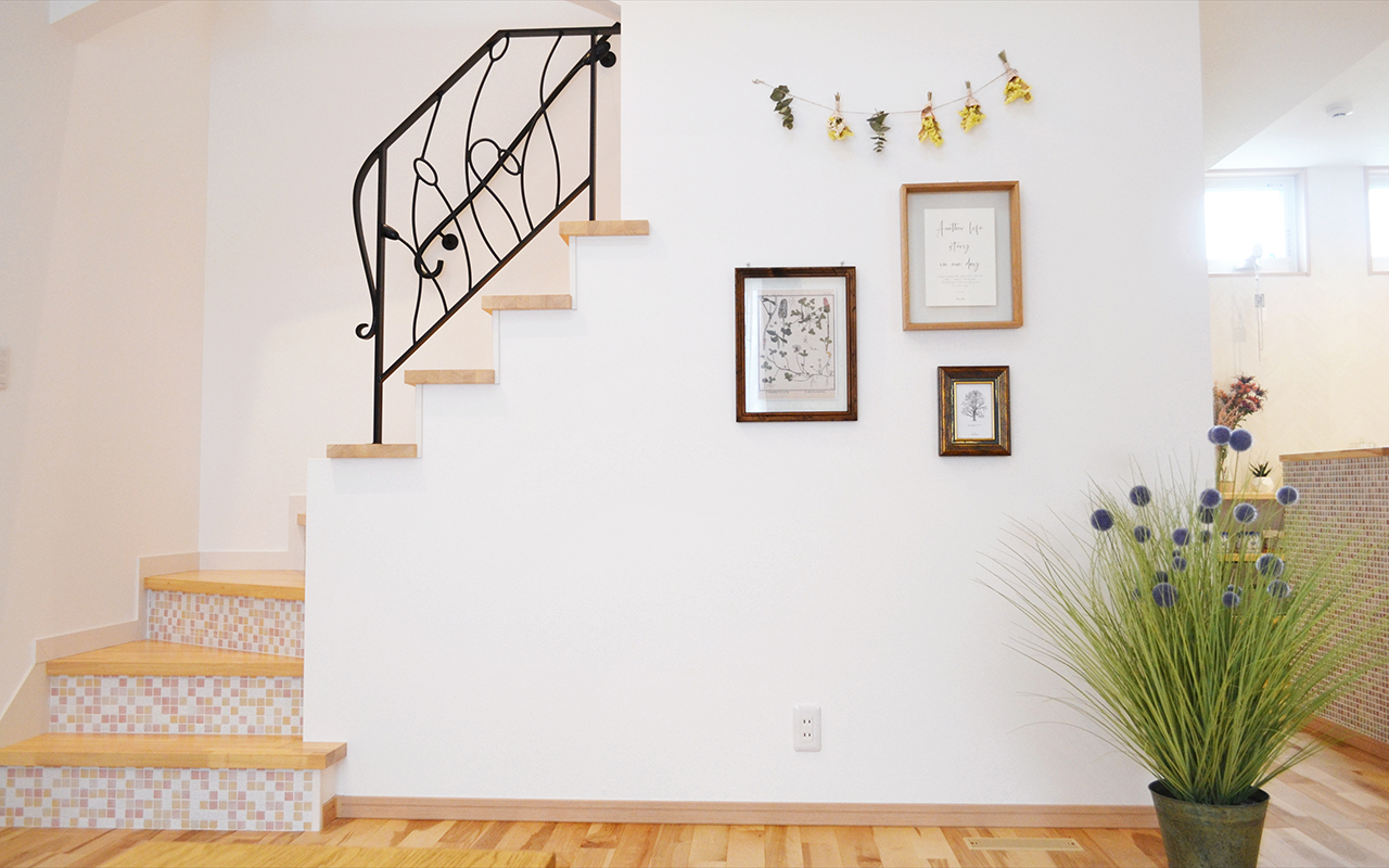階段の正面蹴込部分にはモザイクタイルを散りばめ、二階に上がるのが楽しみになるデザインです。造作の食器棚や勉強机など、御施主様のこだわりが詰まったお家です。