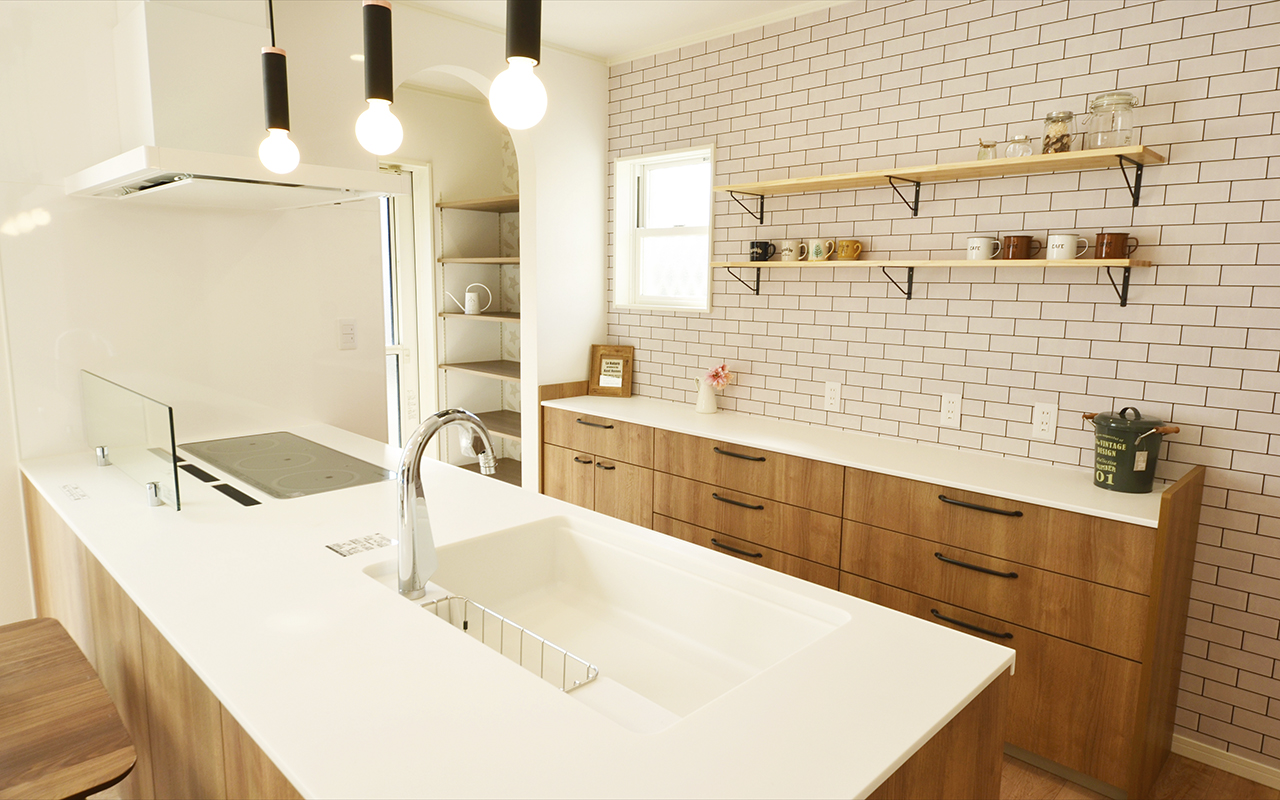 3連の可愛いシンプルなペンダントライトで手元を照らし、背面には白いタイル調に仕上げました。食器棚は下台だけとし、造作の棚には可愛い雑貨を飾れます。