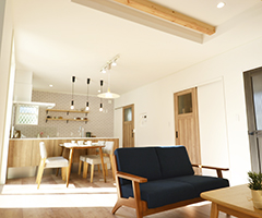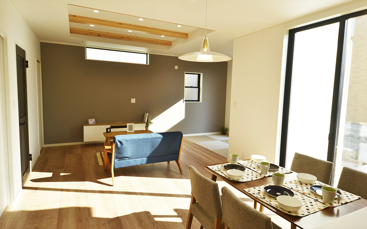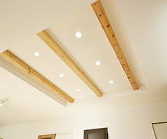 梁見せの造作天井に明るめの無垢材を使用し、木のもつ温かさを大事にしたリビングです。