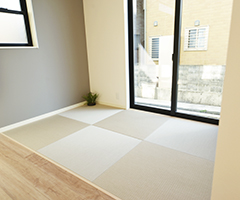 和室の琉球風畳はベージュでリビングの雰囲気を壊さず更に暖かみの増すデザインに。