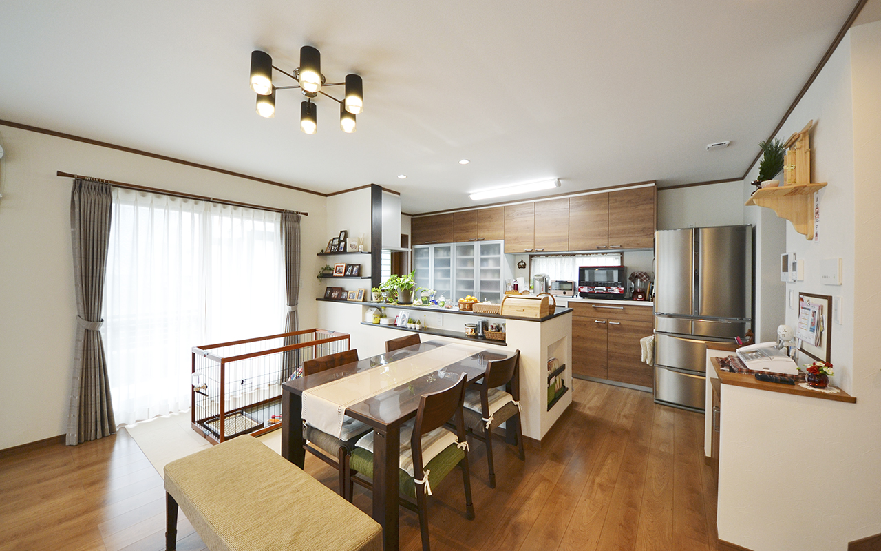 リビングの床材にはチェリー色の大人っぽいデザインを採用。