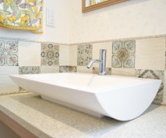 前面にベージュ職のタイル、奥面にはブラウン系のタイルを採用しガラス棚で雑貨を飾れるようにしました。右側には大工さんお手製のスリッパラック。
