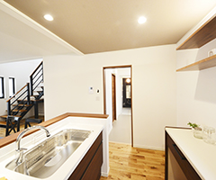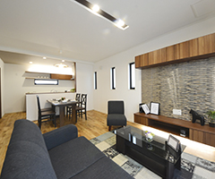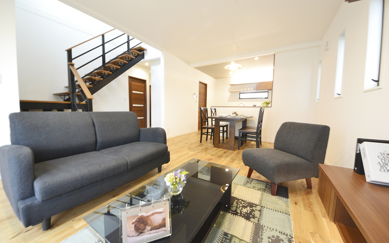 鉄骨の階段に、無垢の床、濃い目の室内ドアで高級感の中にも暖かみをもたらし、ご家族が落ち着きを持てるリビングに仕上がりました。 -