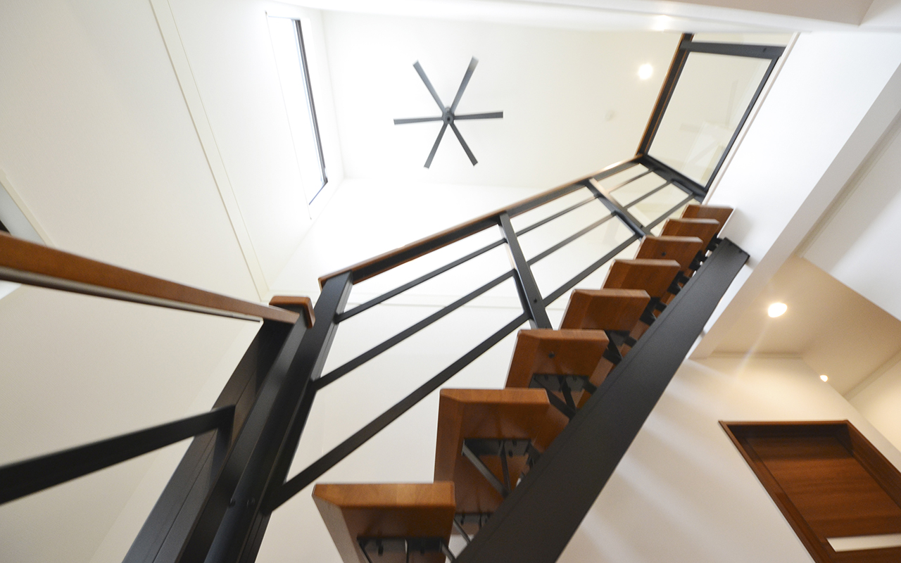 鉄骨階段の上部は吹き抜けになっており、とてもおしゃれな仕上がりに。